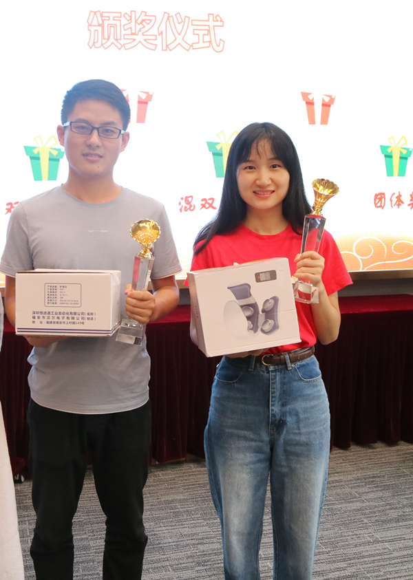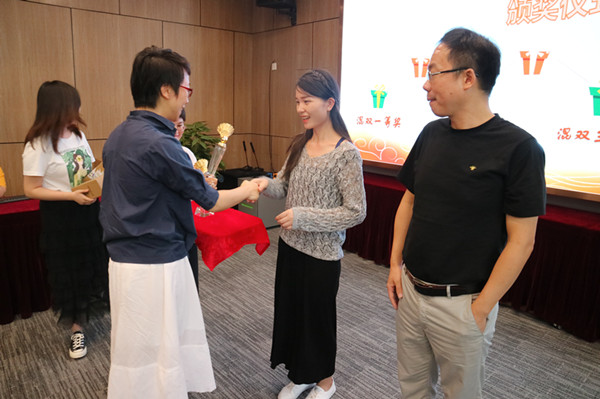 副总经理毛迎霞为混双三等奖获得者王雁然、张愉颁奖