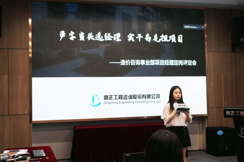 造价咨询事业部项目经理定岗级别为项目经理、高级项目经理、资深项目经理,共有13名专业工程师经部门经理提名或自荐报名参与,通过笔试、自述、答辩、评定四个环节最终评定。评定小组由董事长王雁然、技术总监朱立冬、副总经理毛迎霞、造价质控部技术总工王青、陈嵘组成。