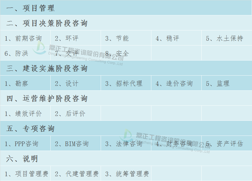 本文提供的全咨取费参考标准包含以下内容: