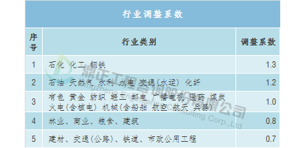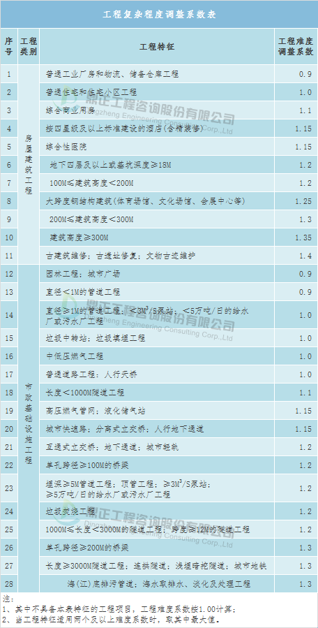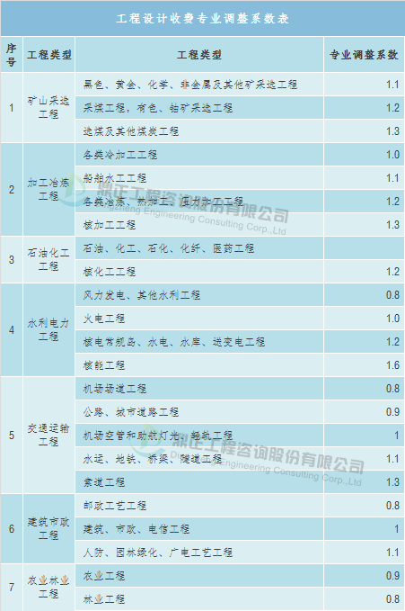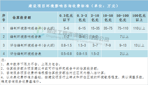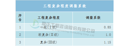 工程复杂程度调整系数:0.8~1.2(工程复杂程度具体调整系数由工程咨询机构与委托单位根据各类工程情况协商确定)。环境影响咨询取费可参考《建设项目环境影响评价收费标准》(计价格〔2002〕125号),以估算投资额为计费基数,根据建设项目不同的性质和内容,采取按估算投资额分档定额方式计费。