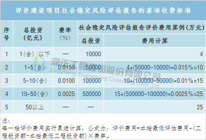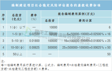 按照上述调整系数对建设项目社会稳定风险评估咨询服务收费进行调整后,编制建设项目社会稳定风险评估报告的收费低于6万元的,按6万元计取,高于50万元的按50万元计取;评价建设项目社会稳定风险评估报告的收费低于4万元的,按4万元计取,高于25万元的,按25万元计取。水土保持咨询服务取费可参考《关于开发建设项目水土保持咨询服务费用计列的指导意见》(保监〔2005〕22号),其中可行性研究阶段的开发建设项目水土保持方案编制费可参考下表标准计列。防洪评价咨询取费可参考地方收费标准,如湖南省地方标准——《湖南省物价局、湖南省水利厅关于公布水利系统服务性收费项目和标准的通知》(湘价服〔2013〕134号),具体如下: 交通影响评价咨询取费可参考中国城市规划设计研究院编制的《建设项目交通影响评价报告收费标准》,具体如下: 安全评价可参考地方收费标准,如湖北省地方收费标准——《省物价局 省安全生产监督管理局关于安全评价服务收费有关问题的通知》(鄂价工服〔2016〕56号),具体如下: 安全预评价的总投资额为可行性研究报告中的估算总投资额,不包括土地征用费和流动资金;安全验收评价的总投资额为实际总投资额。安全评价服务收费采用插值法计算确定。插值法计算公式如下:评价费用=(评价费用上限—评价费用下限)×(总投资额—投资区间下限)/(投资区间上限—投资区间下限)+评价费用下限本收费标准不含专家评审费和检测检验费用。